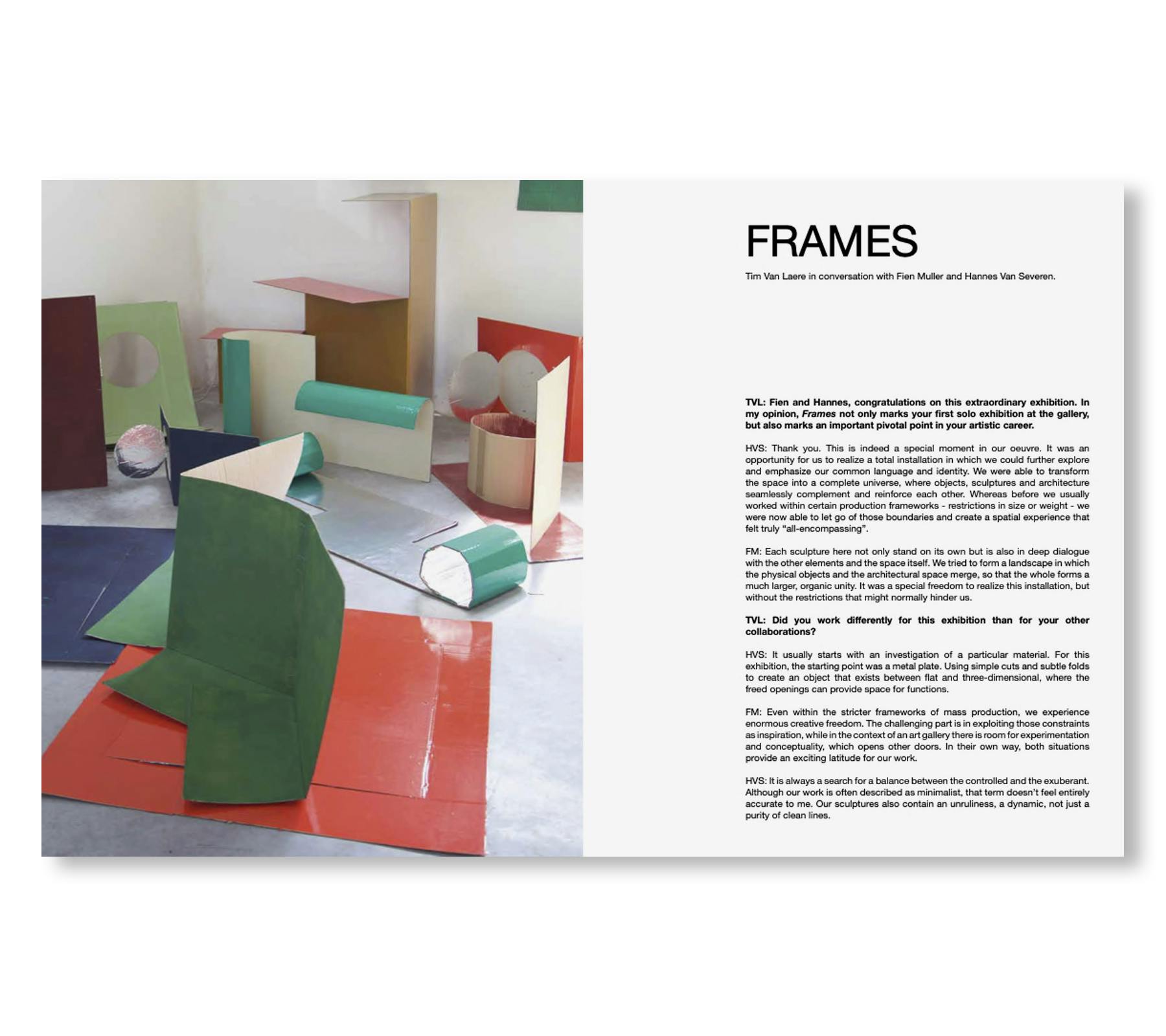 作者らは本書において、共通の言語とアイデンティティをさらに発展させられる総合的なインスタレーションを創出することが意図であったと強調する。実践においては、作者らはデザイナーとしてではなく、彫刻家として活動した。『The Frames』シリーズは平らな金属板から生まれた。その過程で、作者らは切断と折り曲げという2つの基本的な動作に自らを限定した。空間は、オブジェ、彫刻、建築がシームレスに補完し合い、互いを強化し合う宇宙へと変容した。これまでサイズや重量の制約がある特定の生産枠組みの中で作業することが多かった作者らだが、今回は境界を手放し、包み込むような空間体験を創出した。