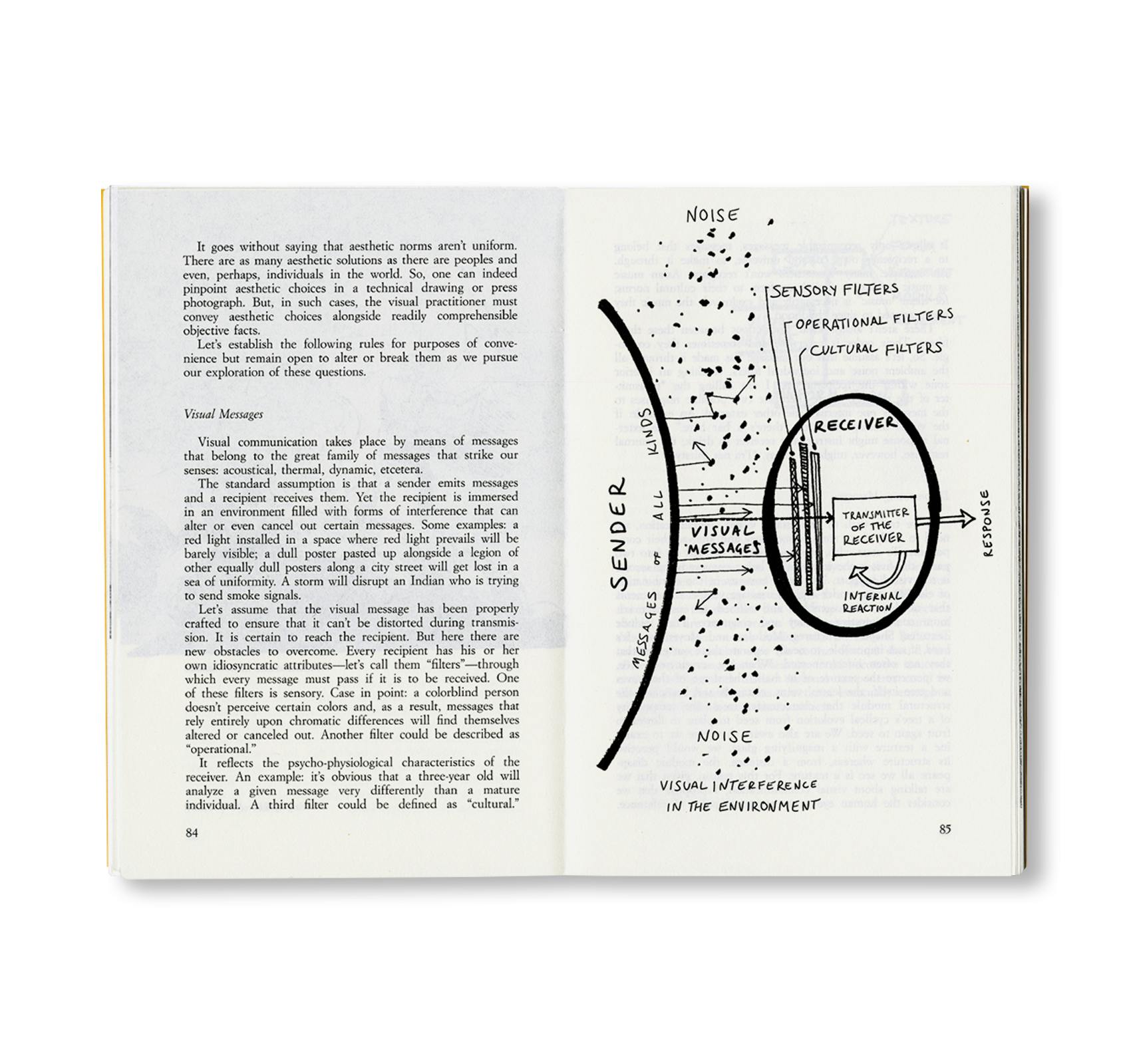 「ヴィジュアルコミュニケーションは、ドローイング、写真、立体モデル、映画といったものを含み、抽象的な形態から写実的な形態まで、静止画から動くイメージ、単純な図像から複雑なものまで、あらゆるものを包含している。さらに、図と地の関係、迷彩、モアレ模様、錯視、蜃気楼、残像といった視覚知覚の領域にも及ぶ。ヴィジュアルコミュニケーションは、タイポグラフィのフォント設計から新聞紙面のレイアウト、単語の可読性の限界の探求から文章を読みやすくする技術に至るまで、グラフィックに関わるすべての側面を含んでいる。こうしたヴィジュアルコミュニケーションの諸側面には、共通したある性質が存在する。それは“客観性”である。」