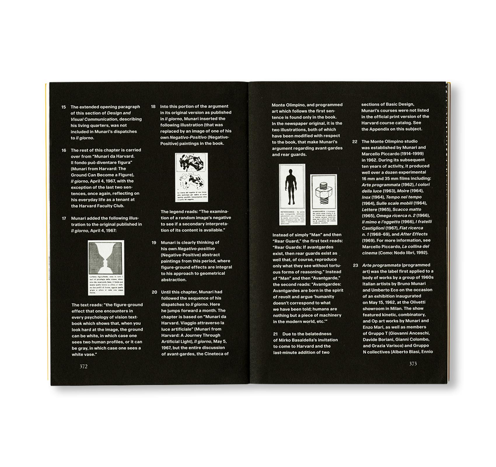 本書は、ブルーノ・ムナーリによる名著『Design e Comunicazione Visiva』(1968)の、史上初の英語翻訳版の復刻版にあたる一冊である。ハーバード大学カーペンター・センターで客員教授を務めた後に出版された本書は、50を超えるレッスン、教材、そしてアメリカでの生活を綴った手紙までも取り入れながら、芸術・建築・デザインの未来について語る一冊へと昇華され、デザイン教育と日常生活をつなぐ重要なガイドであり続けている。「生きた書物」として構想された本書は、読者である現在および未来のデザイナーに対し、つい最近の過去のものであれ古い枠組みに囚われず、明日の世界を見て理解するための新たなツールを生み出すことを促している。