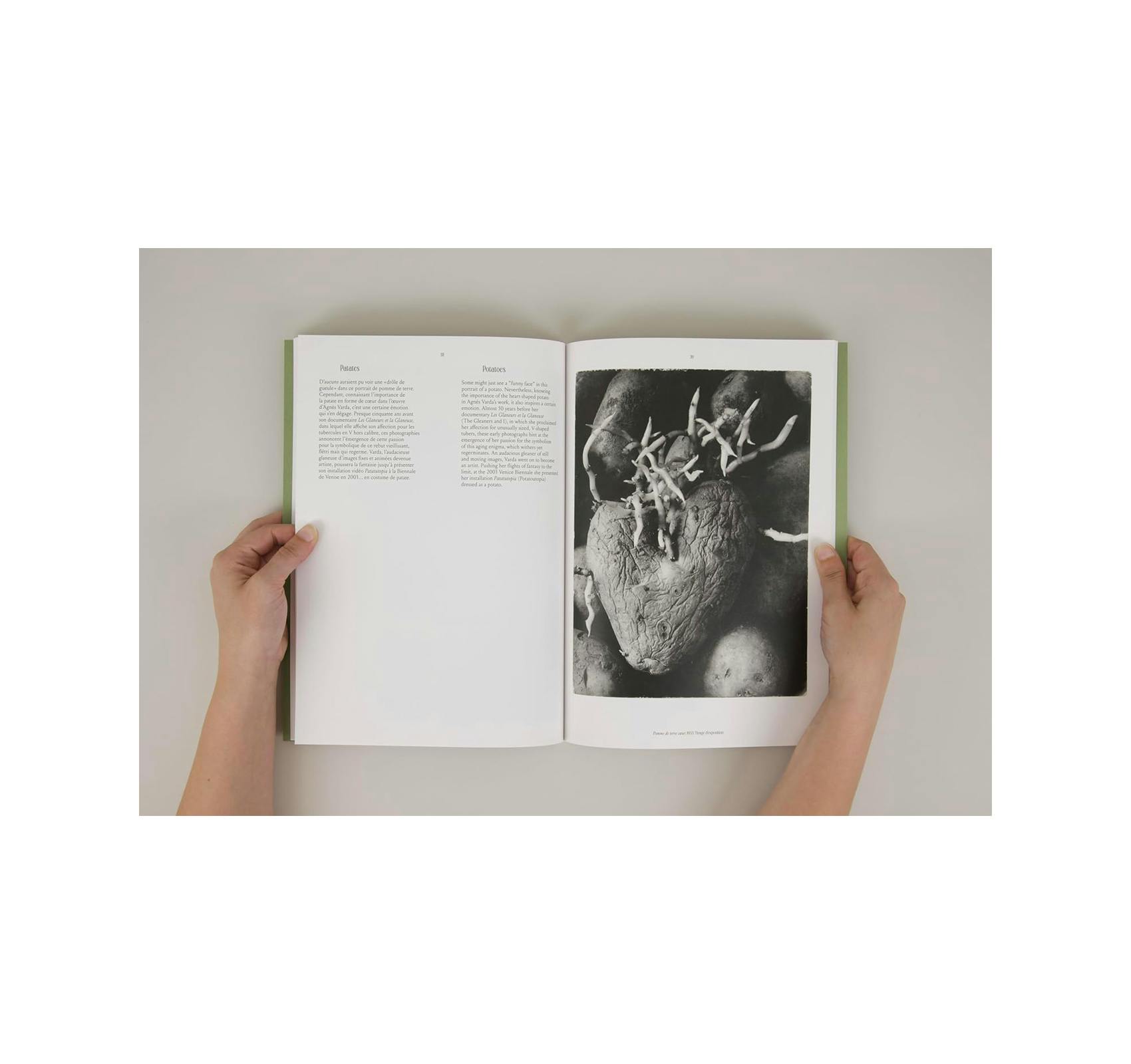 ここにはすでにユーモアと言葉への愛着がほの見える。作者が“funny faces(おどけ顔)”と呼ぶ日用品の個性的な扱い、2000年のドキュメンタリー映画『落穂拾い』(原題:Les Glaneurs et la Glaneuse)にも繰り返し登場するハート形のジャガイモ。そして、力線を見極め、遠近を配し、形と質感で抽象の縁までまなざしを操作した、作者のキャリア初期にフランスのリゾート地セットで撮られたイメージも並ぶ。作者は自身の“curious eyes(好奇の眼)”で見る世界へと私たちを誘う。