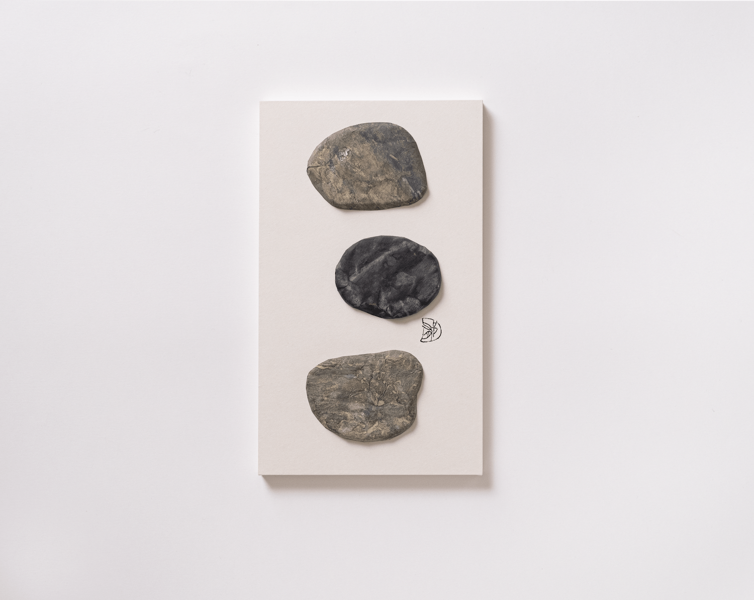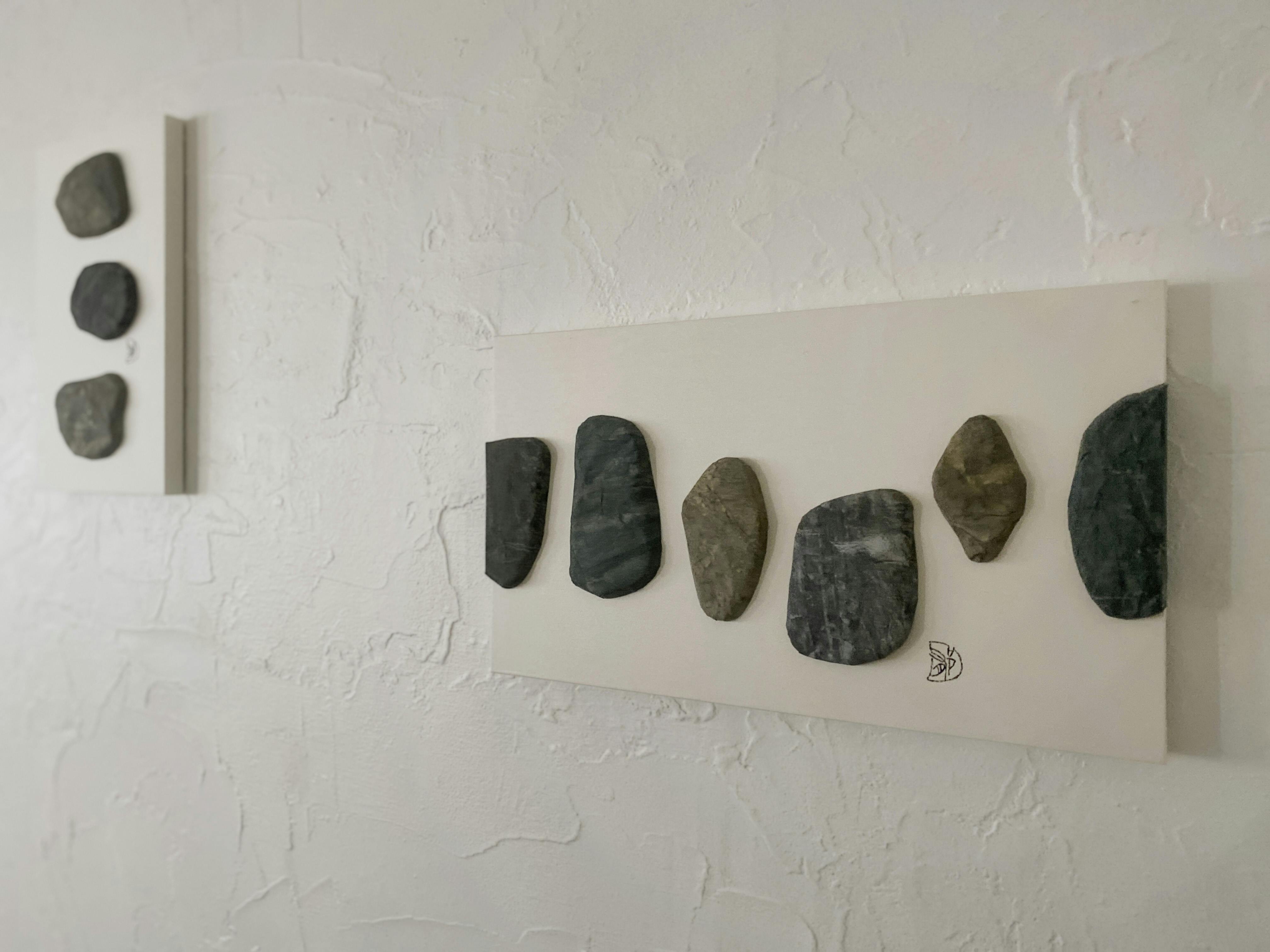 紙の上に何度も色を重ね、皺を刻んでいく。絵の具の滲み、粒子の溜まり、ひび割れ、いくつもの現象を起こしながら石が石になっていく時間をたどっている。石の表面は絵画であり、自然が作り出した彫刻である。