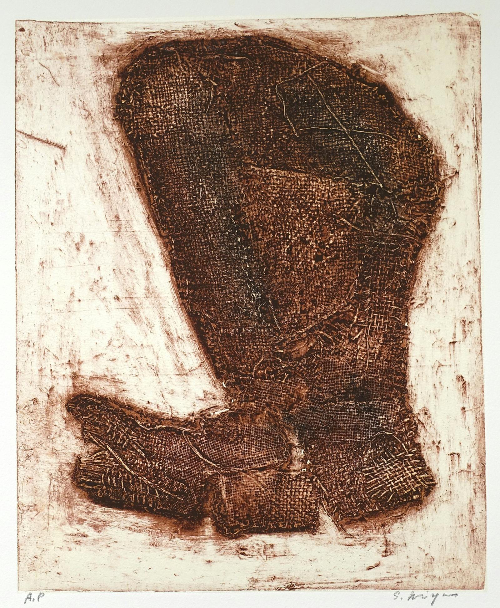 ドンゴロス(目の粗い麻布)を画面にコラージュした作品は宮崎の代表作ですが、同じくドンゴロスを版にしたコラグラフ作品です。