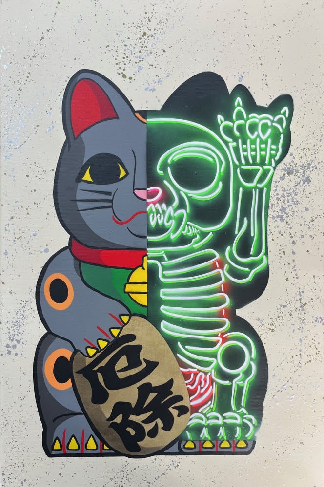 "Maneki Neko 50:50" explores the duality of contemporary existence. It reflects on our common tendency to present a curated, endearing facade – the widely accepted, adorable persona designed to attract opportunity and blend seamlessly into societal norms. Beneath this performative surface, however, lies an intrinsic, vital luminescence: our authentic selves. I believe this inner radiance resides within everyone, often obscured by the protective layers we construct. Within the work, vibrant neon lights pierce through the familiar form, symbolizing these obscured yet irrepressible true colors.